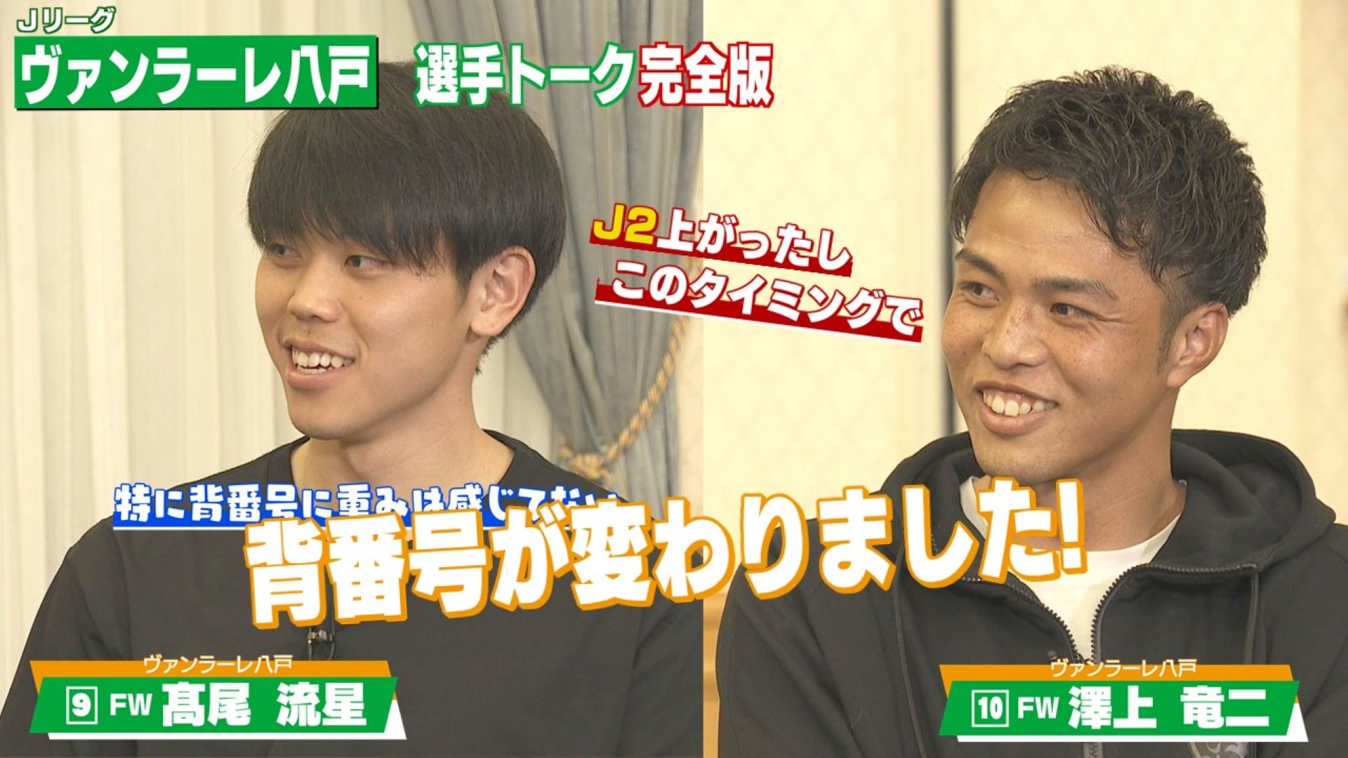今回は、ともにヴァンラーレで2シーズン目を迎えるFW澤上竜二選手とFW髙尾流星選手が登場。今季は2人とも背番号が変わり、新たな気持ちでキャンプを過ごしているが、その経緯や新背番号への思いについて詳しく聞く。