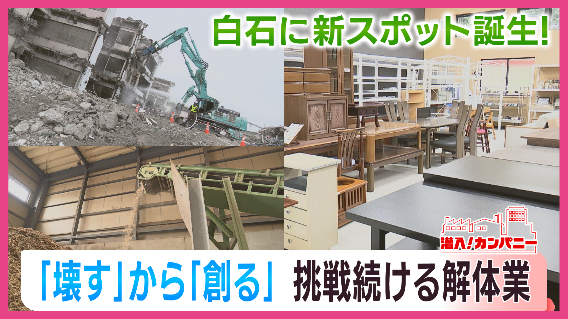県内の企業をはじめ、工場や現場に潜入し、その仕事の裏側に迫る「潜入!カンパニー」。平日の夕方(午後4時35分~)に放送している「チャージ!」の人気コーナーを特別拡大版として放送します。第3弾となる今回は、「サン・ベンディング東北」「白石食品工業」「フジ・コーポレーション」「竹中工務店」の裏側に潜入!誰もが知るスゴい企業のウラ側、そして宮城のために働く人たちの熱い思いに迫ります。▼数万台の自販機を設置する企業が目指すのは…▼タイヤ・ホイール専門店の巨大倉庫に何が?▼20周年を迎える大人気パンの秘密▼最新のビルを建設!大手総合建設会社の思い -